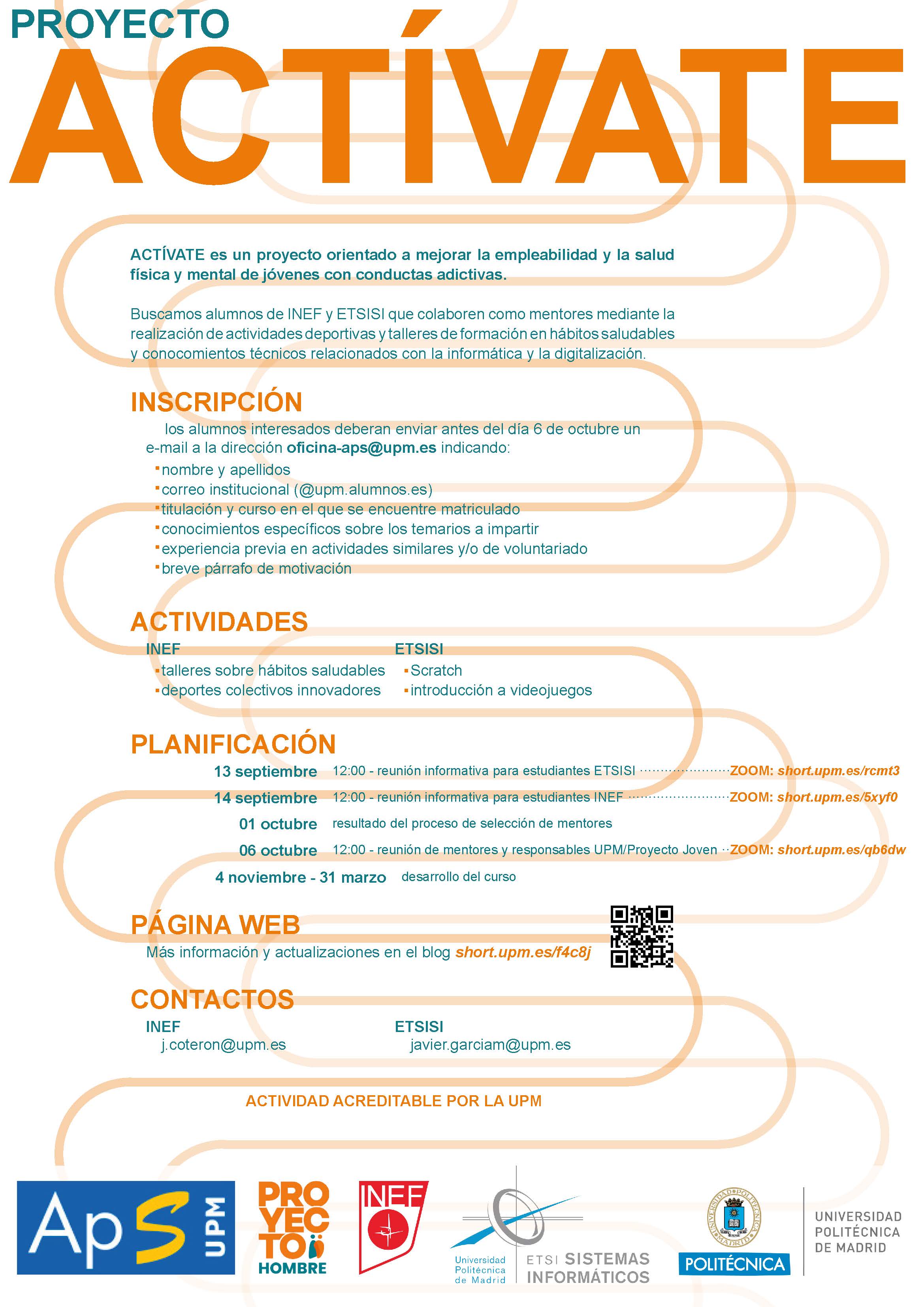 Desde la Oficina de Aprendizaje Servicio de la UPM y Proyecto Joven, iniciativa dentro de Proyecto Hombre, (https://proyectohombre.es/prevencion/), se ha diseñado un proyecto (Actívate) que pretende mejorar el acceso al mercado laboral de jóvenes afectados por algún tipo de adicción a la vez que crear en ellos hábitos saludables.